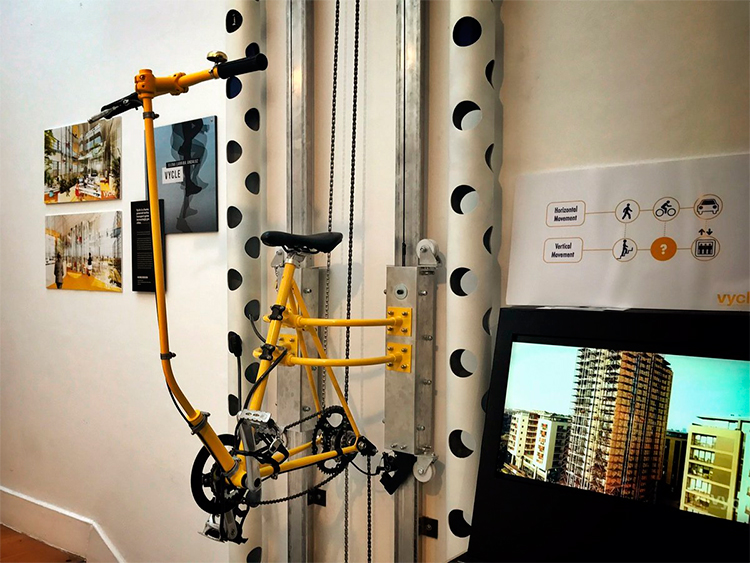 ¿No lo ha entendido? ¡Tranquilo, ahora se lo explicamos (risas)! Elena desarrolló un prototipo que tiene como objetivo servir como opción para los desplazamientos entre los pisos de un edificio. Se trata de una bicicleta que, al ser usada, permite el desplazamiento vertical de las personas. Bautizada como Vycle, posee manillares, pedales y sillines, como una bicicleta cualquiera. Pero, en vez de ruedas, cuenta con una estructura en la parte trasera que puede ser fijada en un carril.